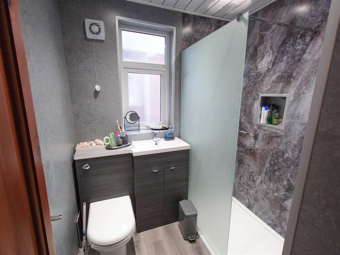A contemporary shower room all beautifully finished with a modern theme which includes a walk-in style shower enclosure with a glazed shower screen, mains plumbed thermostatic shower including rainfall shower head, wash basin and low flush W/C inset to bathroom furniture. A PVC double glazed window, extractor fan, contemporary style towel rail/radiator and water proof style ceiling within inset spotlighting and feature display niches.