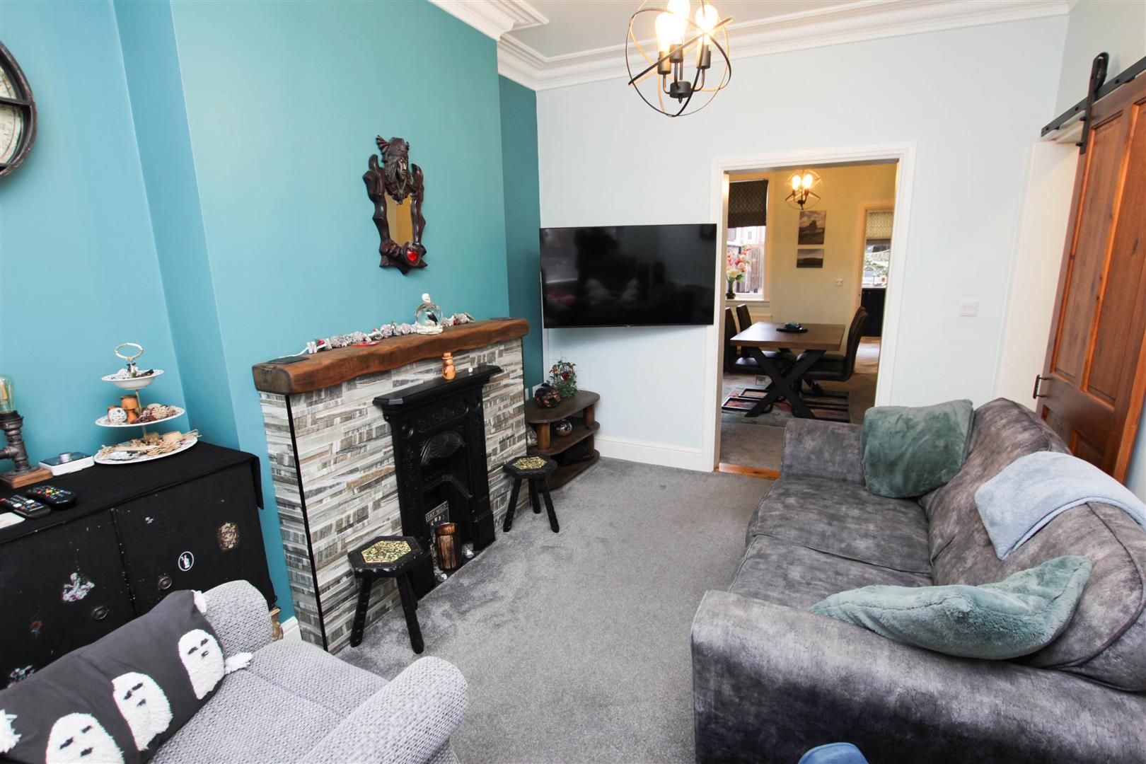 This has a PVC double glazed window to the rear, a central heating radiator, wall mounted timber over mantel, ornate cornicing to the ceiling, central ceiling light and a part glazed door which leads into the kitchen.