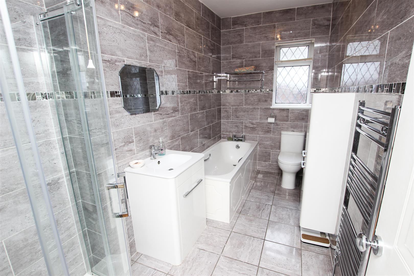 The kitchen is fitted with a range of high and low level units finished with a Shaker style cabinet door, contrasting work surface over. There is a four ring gas hob with an extractor hood above, integrated oven, single drainer 1½ bowl stainless steel sink unit with a mixer tap, the work surface extends to provide a breakfast bar. There is also integrated fridge and freezer, plumbing for an automatic washing machine and concealed behind one tall cabinet is a gas fired combination type boiler which supplies domestic hot water and central heating systems. There are two pvc double glazed windows, central heating radiator, tiled floor covering, coving and a central ceiling light. A pvc double glazed exterior door from here gives access into the properties rear garden.