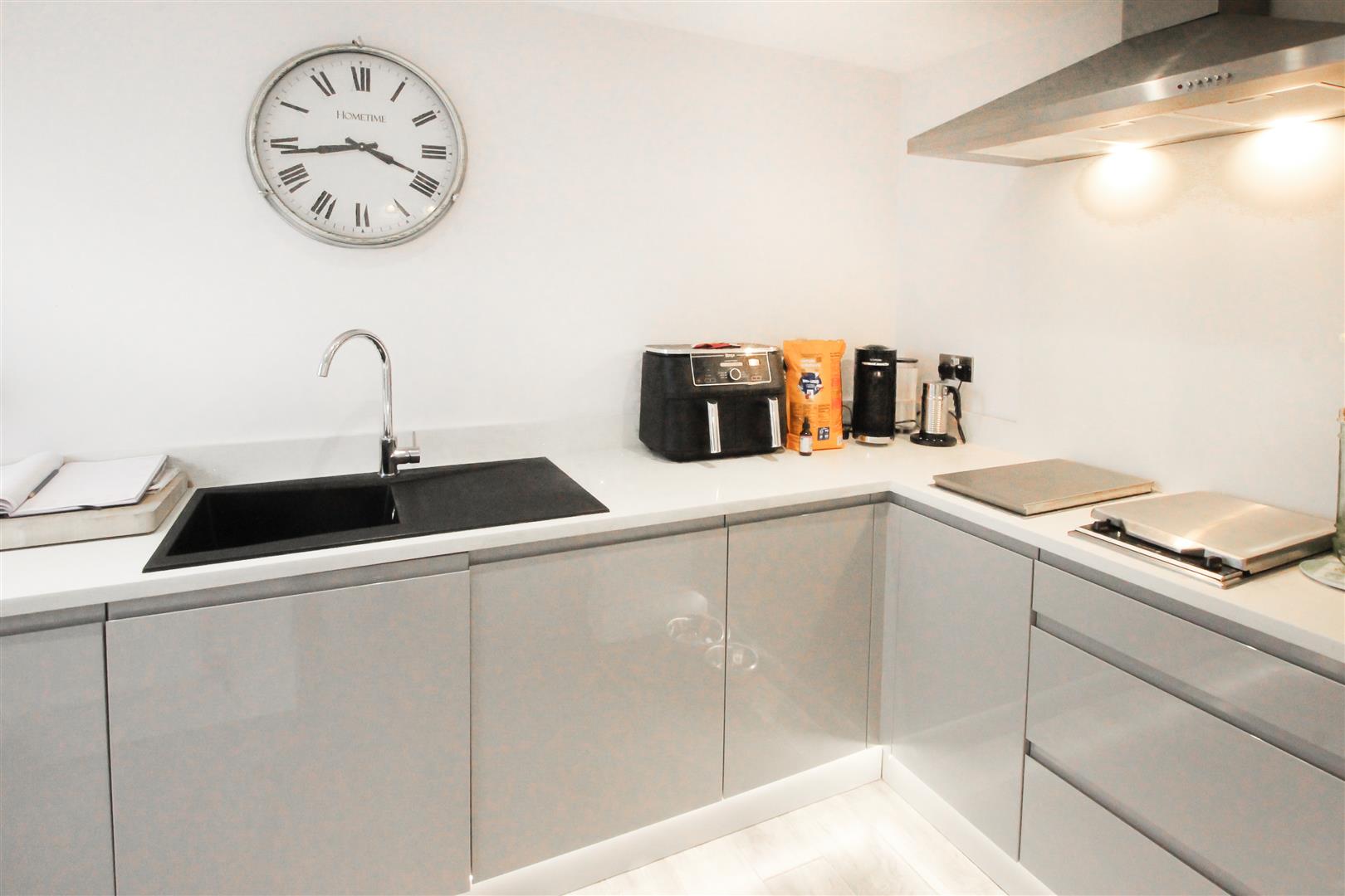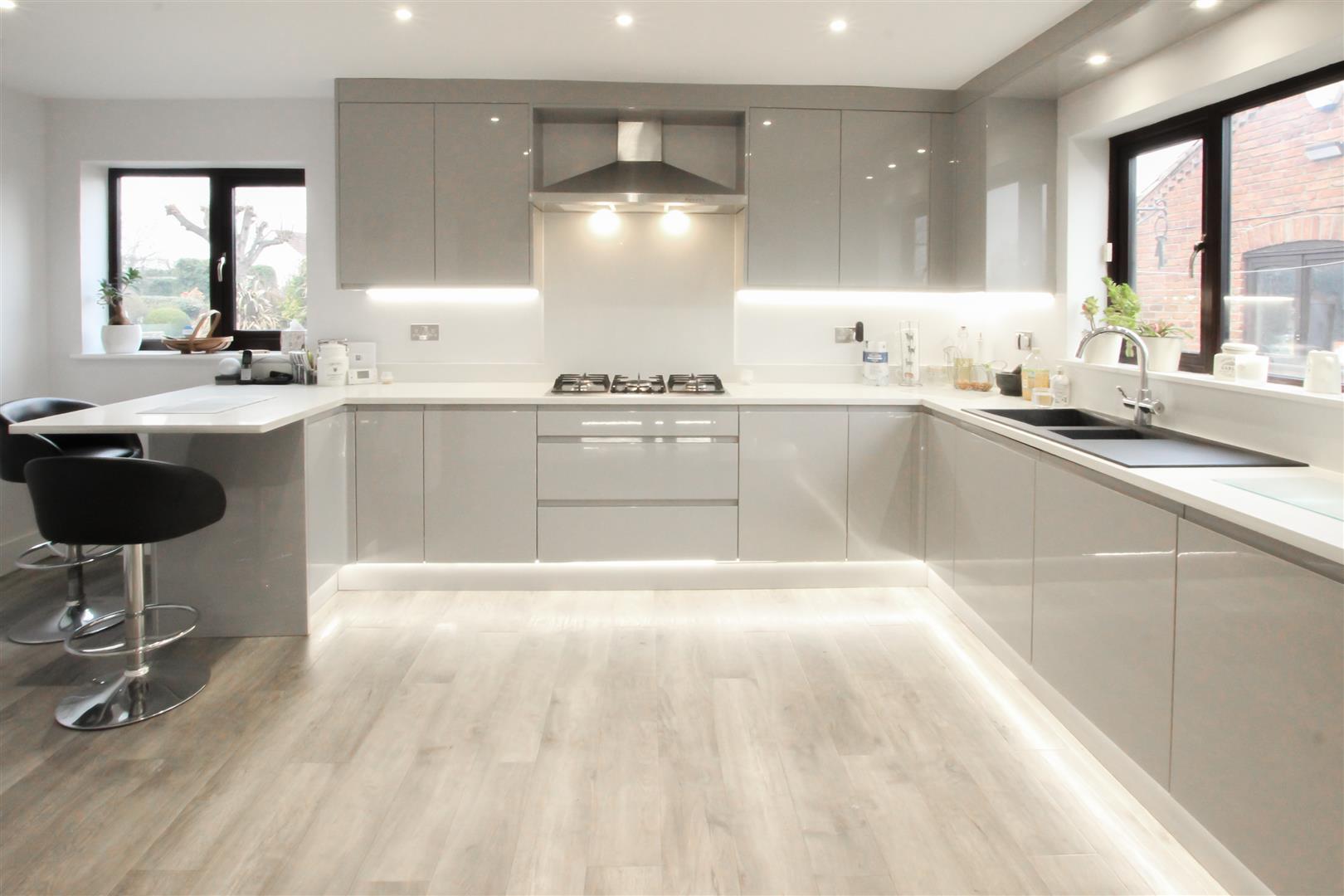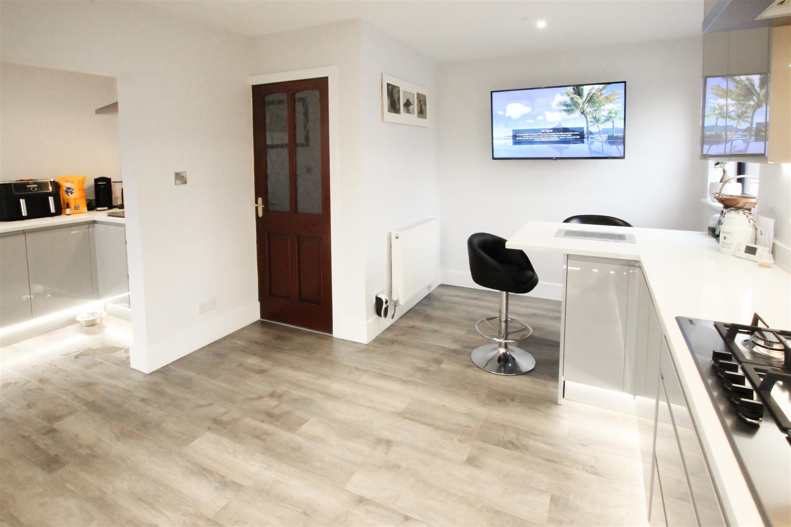 A stunning modern breakfast kitchen recently remodelled and fitted with a range of contemporary high and low level units with grey high gloss cabinet door and a quartz diamante style work surface with a matching splashback. Integrated appliances include a five ring gas hob with wok burner, chimney style extractor hood, integrated combination style microwave oven, ‘qettle’ style boiling hot water tap, integrated fridge and an integrated dishwasher. There is also a separate food prep area with a further composite sink, mixer tap, an additional two ring gas hob and deep fat fryer with an extractor hood above. Three PVC double glazed windows to the side and rear, a pvc double glazed door, central heating radiator, feature kick-board lighting, Karndean flooring, under cabinet lighting and spotlighting to the ceiling.