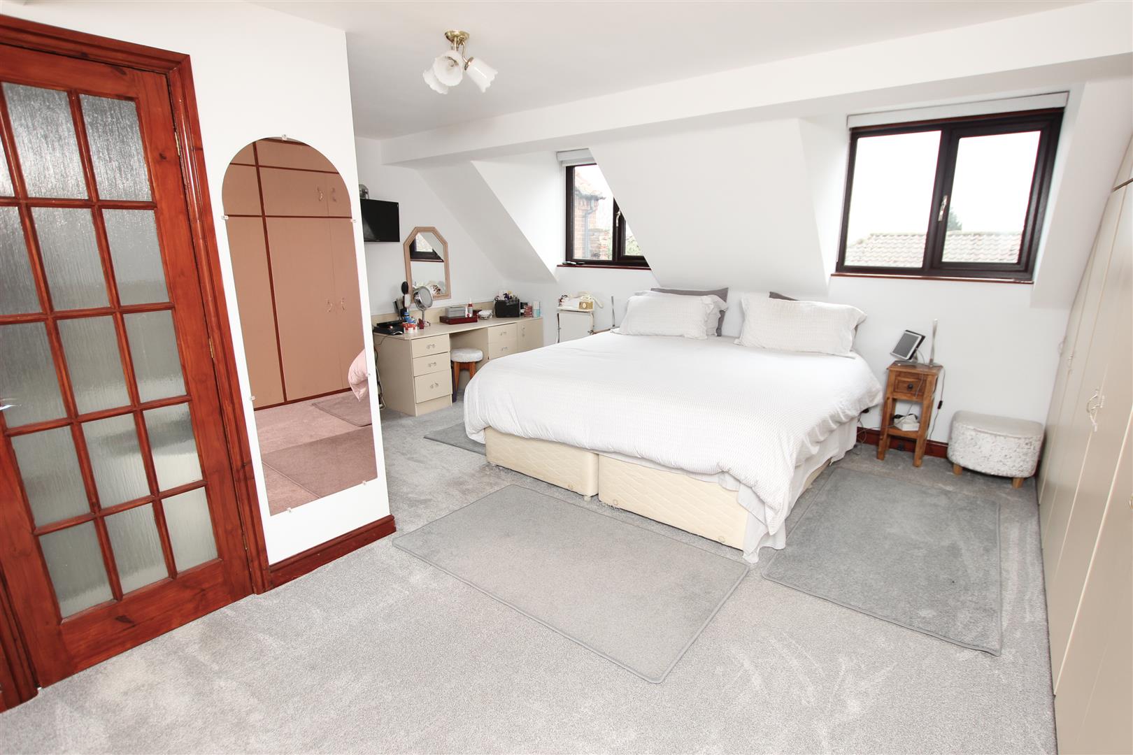 This has three PVC double glazed windows to the side elevations. There are a range of fitted wardrobes concealing hanging rail and storage, a double panel central heating radiator, central ceiling light, and a door leading to the en-suite bathroom.