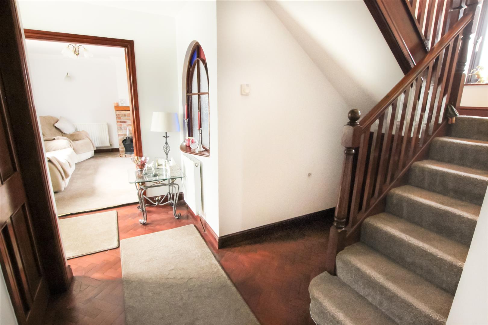 There is a feature staircase to the first floor accommodation with a built in under stairs storage cupboard, herringbone laid flooring, ceiling light, and door to a ground floor w/c.