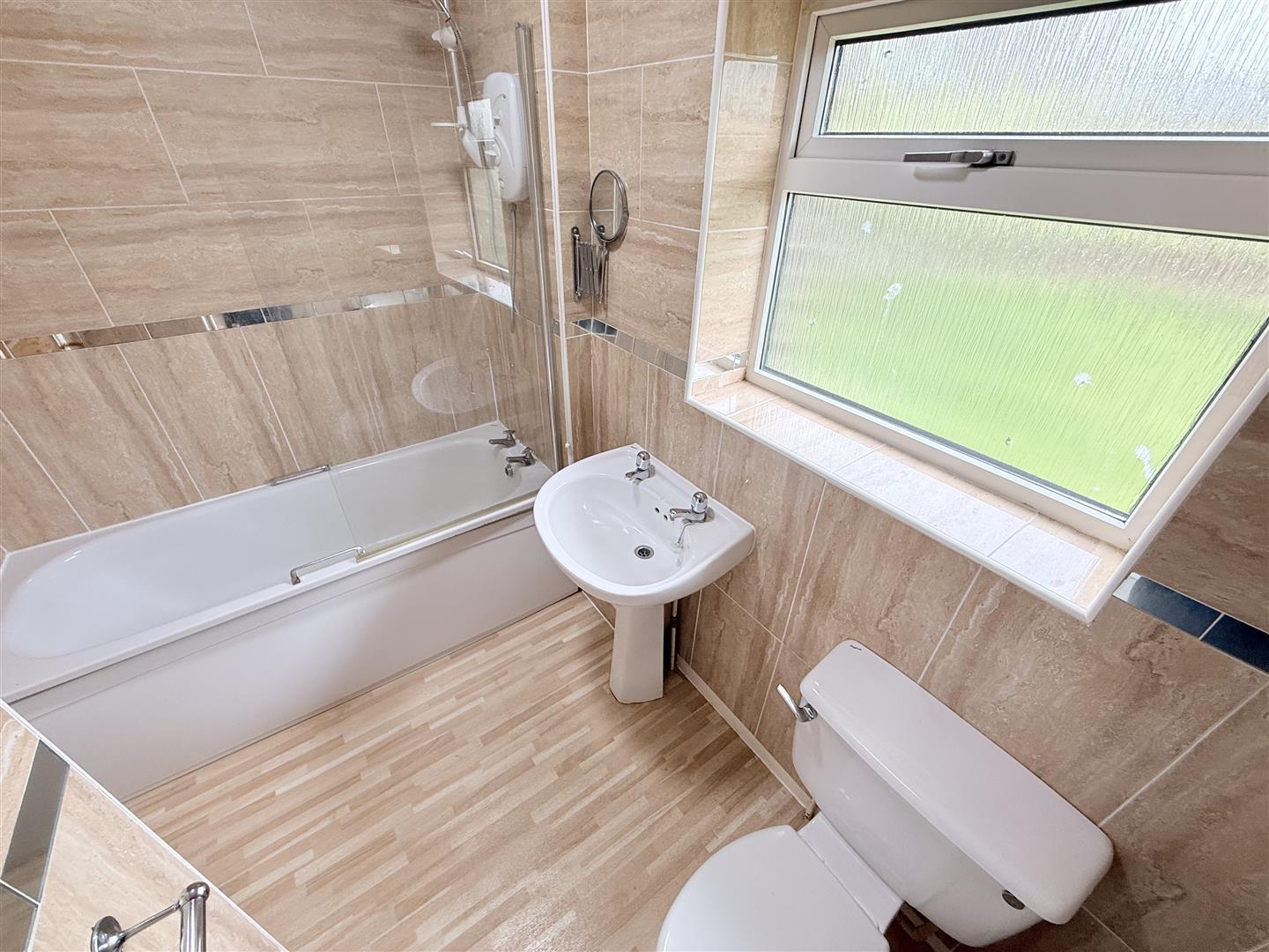 Fitted with a 3 piece white suite comprising low flush wc, pedestal wash hand basin and panelled bath with wall mounted electric shower. There is full ceramic tiling to the wall with a wood effect vinyl floor covering, central heating radiator and pvc double glazed window to the rear elevation.