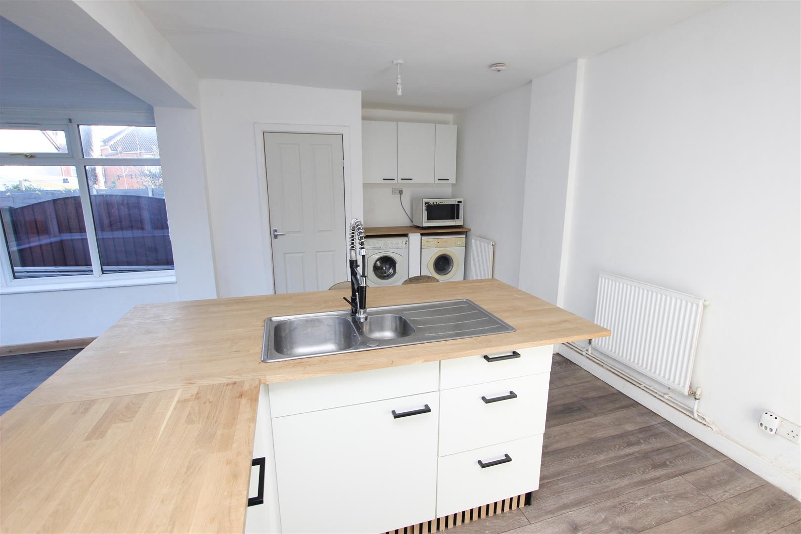 This is fitted with a range of white fronted units with an oak block work surface over, it has a single drainer stainless steel sink unit with mixer tap, integrated oven, ceramic hob and extractor hood. There is a recess and plumbing for a washing machine and tumble drier alongside, 2 central heating radiators, pvc double glazing which gives an outlook into the property's rear garden and 2 pvc double glazed doors. 3 ceiling light points a door to an understairs storage cupboard and a second door gives access to a ground floor wc.