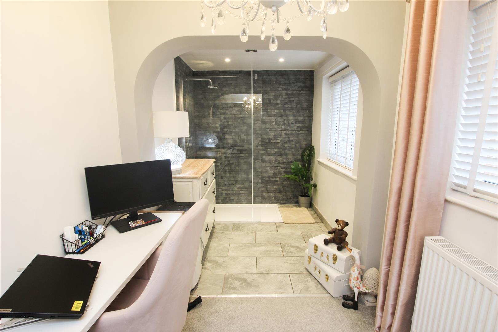 A beautiful large extended bedroom, two pvc double glazed windows to the front elevation, fitted wardrobes inset to the recess along with an additional built-in cupboard with hanging rail and storage, two central heating radiators and two ceiling light points. The bedroom opens directly into an open en-suite shower.