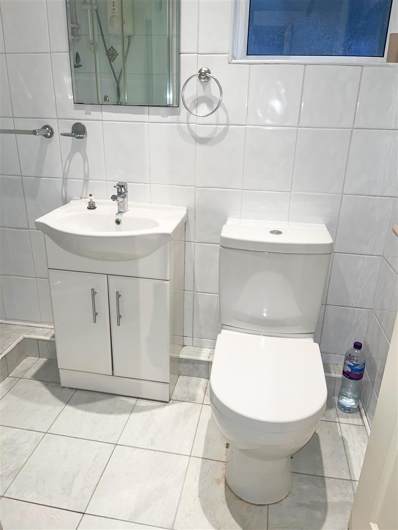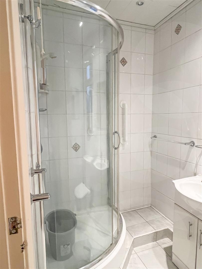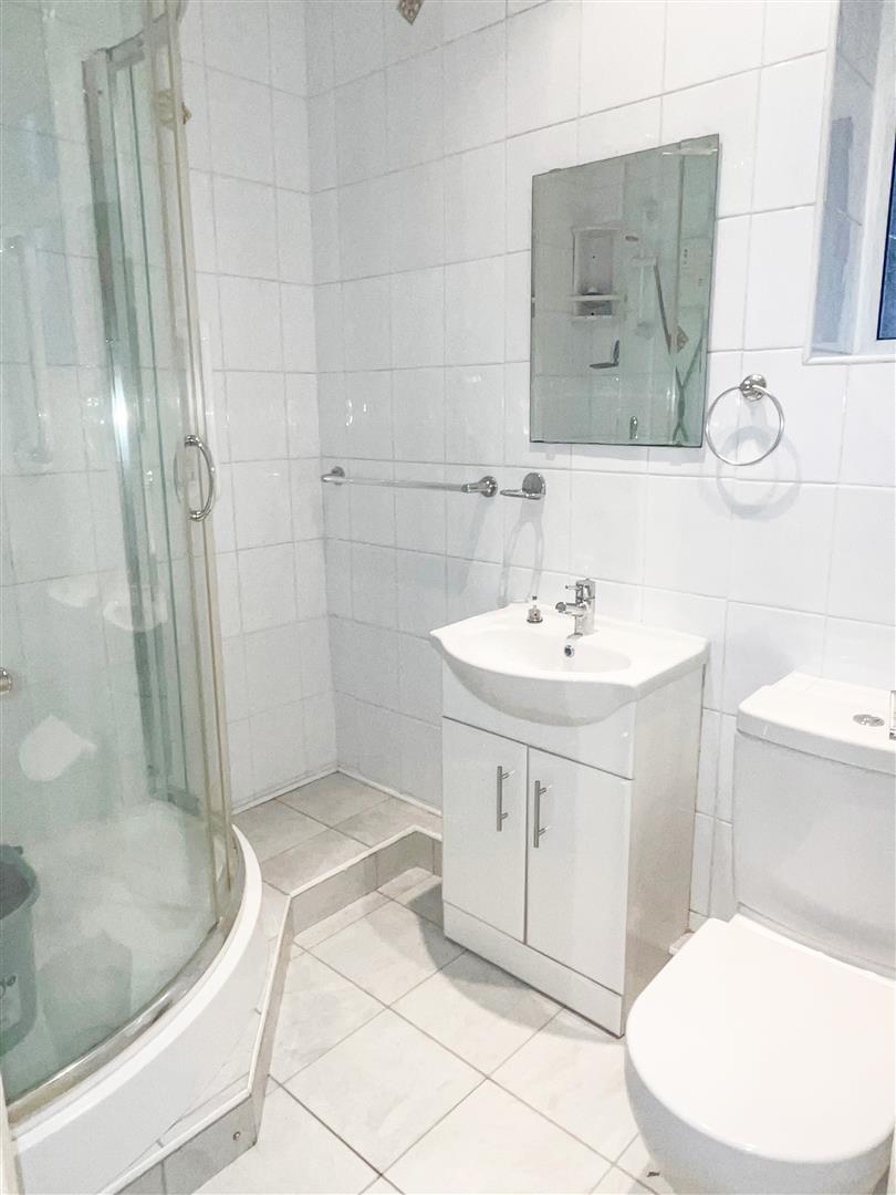 Fitted with a three piece white suite comprising of a low flush W/C, a pedestal wash hand basin set onto a vanity unit and a corner shower enclosure with electric shower. There is tiled flooring, tiling to the four walls, an extractor fan, four inset spotlights to the ceiling and a PVC double glazed window.