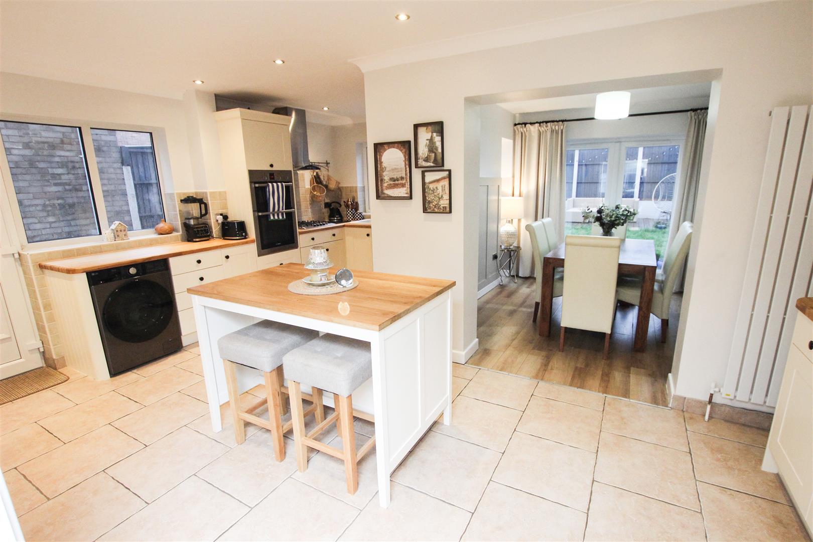 The kitchen has been extended over the years and now creates a large contemporary styled open plan living space. The kitchen is fitted with a range of high and low level units finished with a cream coloured cabinet door and a contrasting oak style block work surface. Integrated appliances include a four ring gas hob with an extractor hood above, integrated double oven and an integrated fridge freezer. There is also plumbing and recess for an automatic washing machine and tumble dryer. Two pvc double glazed windows, a pvc double glazed stable type door, inset spotlighting to the ceiling, central heating radiator, a tall radiator and a built-in understairs storage cupboard.