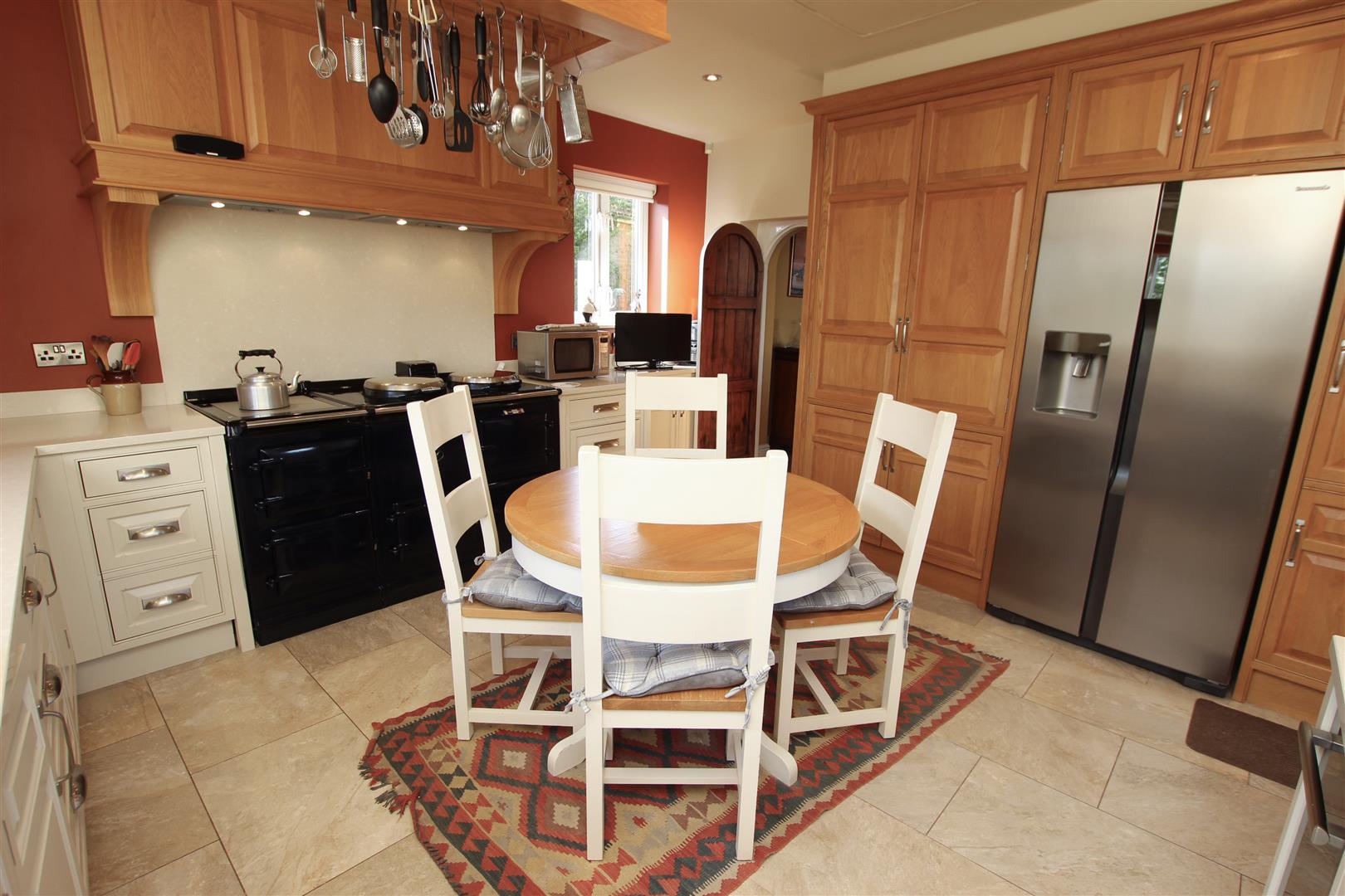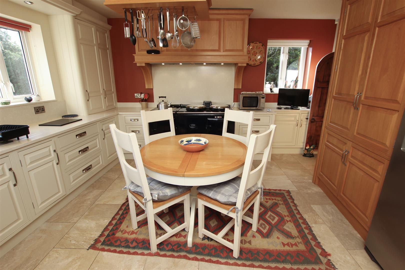 This is fitted with a range of bespoke cabinets manufactured by Derbyshire firm, to a particularly high standard. The cabinets are finished with tulip wood interiors, and a quartz work surface which incorporates an under mounted sink and matching splashback. Within the design there are full height larder style cabinets, with feature LED cabinet lighting, built-in cupboards concealing washing machines etc. with appropriate plumbing laid on, further matching tall cabinets. There is a large 150 Aga with 4 ovens, a warming plate and 2 hotplates and twin extractor fans above. There is additional space for an American style fridge/freezer, recess and plumbing for dishwasher and an integrated wine cooler. A stable type door giving direct access into the gardens, 4 pvc double glazed windows, a porcelain tiled floor, inset spot-lighting to the ceiling.