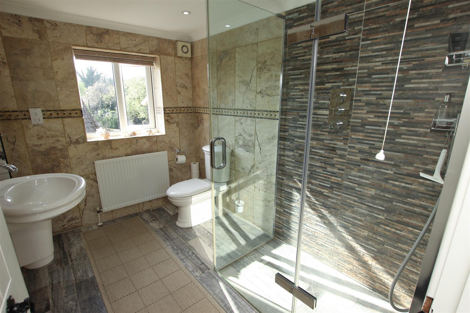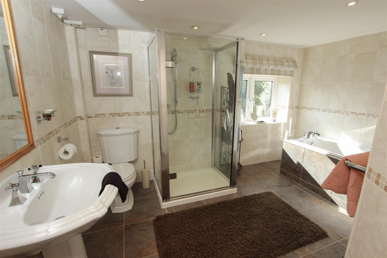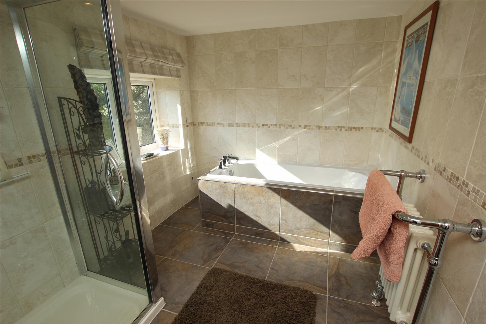 A large bathroom, fitted with a 4 piece white suite that comprises of a panelled bath, a separate shower enclosure, wash hand basin and a low flush wc. It has tiling to the four 4 walls, coordinating floor tile, a period style radiator, inset spot lighting to the ceiling and an extractor fan.