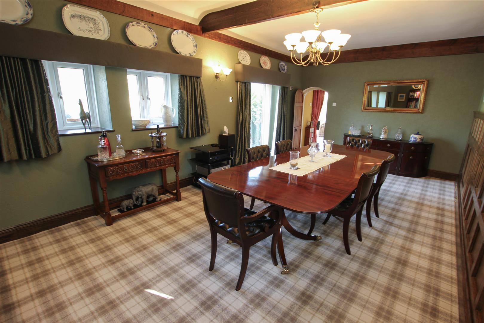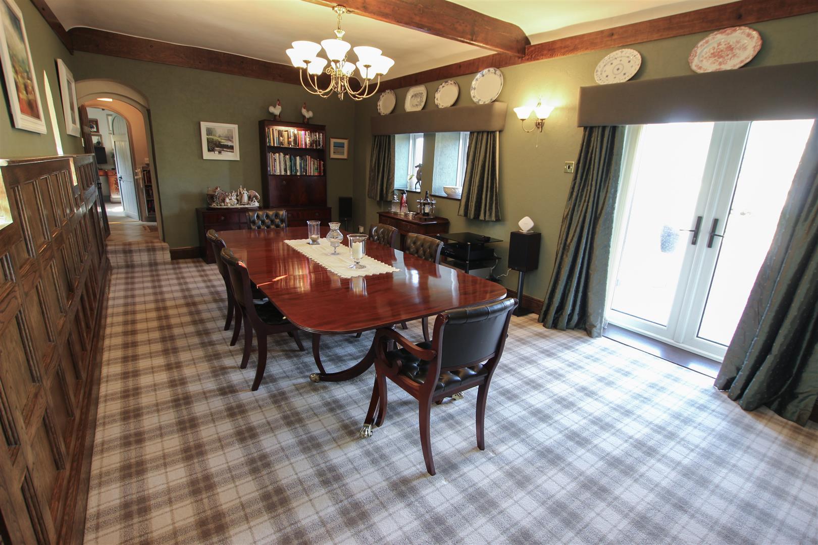 A beautiful statement room, it has feature panelling which covers the full length of one wall concealing radiators, 2 pvc double glazed double opening French style doors, which lead onto the patio and garden, a further pvc double glazed window, ornamental beamed ceiling and 2 feature arched windows.