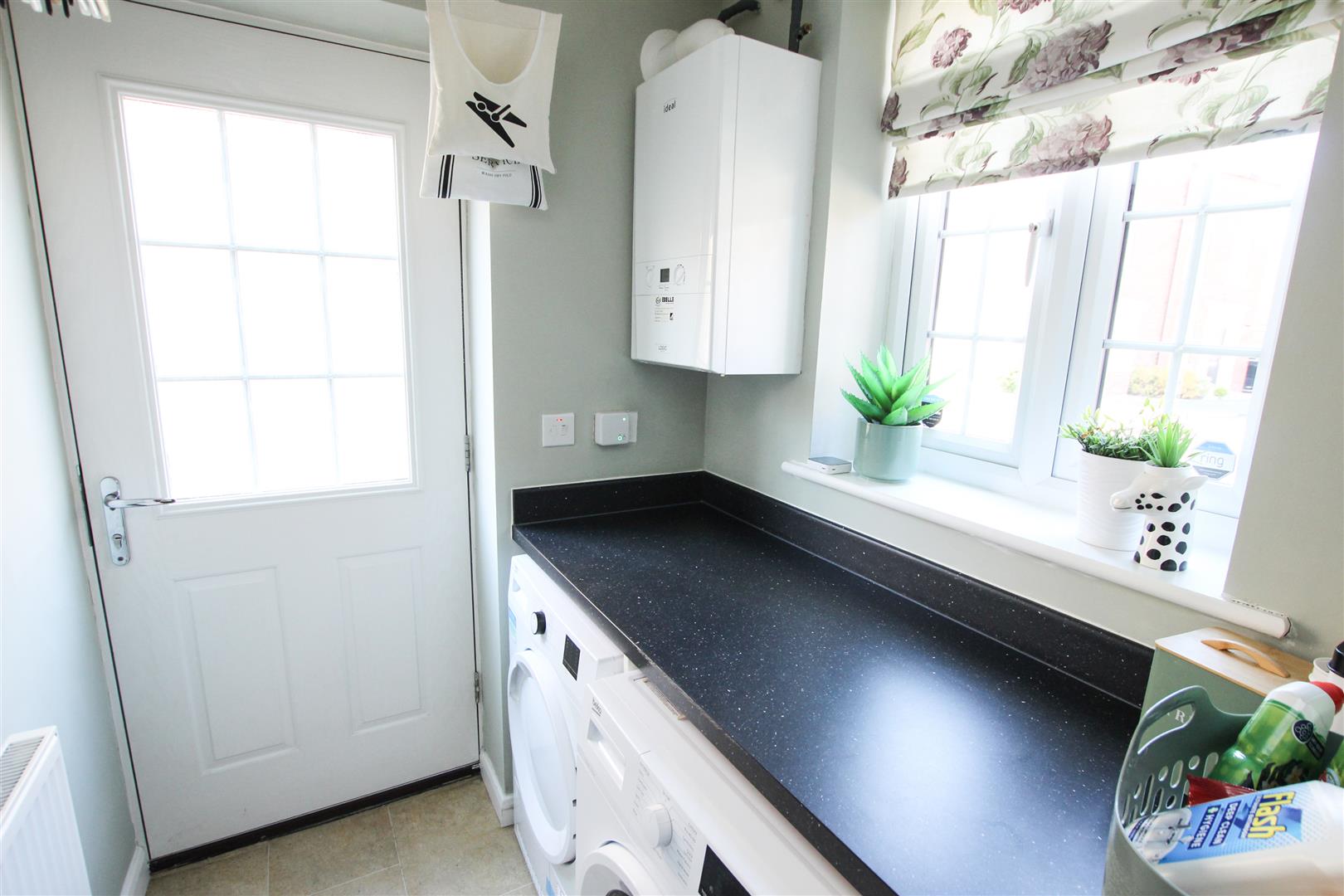 This is fitted with a range of high and low level units finished with a work surface over. There is a deep recess and plumbing for washing machine, tumble driers etc, a central heating radiator, pvc double glazed window, a wall mounted gas fired condensing type boiler which supplies the domestic water and central heating systems, a central ceiling light and a double glazed exterior door to the side.