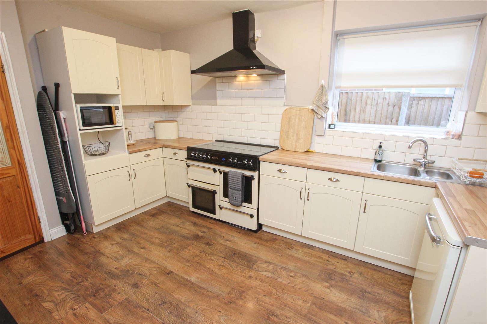 The kitchen is fitted with a range of high and low level units finished with a cream coloured shaker style cabinet door with a contrasting roll edge work surface and tiled splashbacks. There is a large dual fuel range style cooker with an extractor hood above, a single drainer 1½ bowl stainless steel sink unit, plumbing for a dishwasher, laminate flooring, central ceiling light, breakfast bar and a door into a separate utility room.