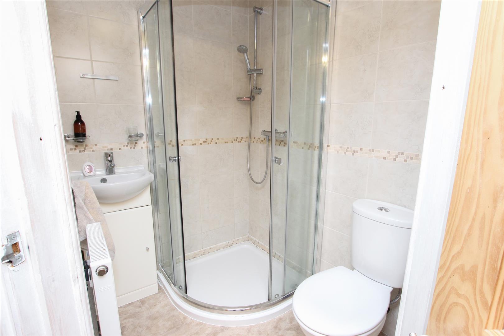 The shower room is fitted with a modern white suite that comprises of a corner shower enclosure, with a wash hand basin inset into a vanity unit, low flush wc, central heating radiator, vinyl flooring, extractor fan and a ceiling light.