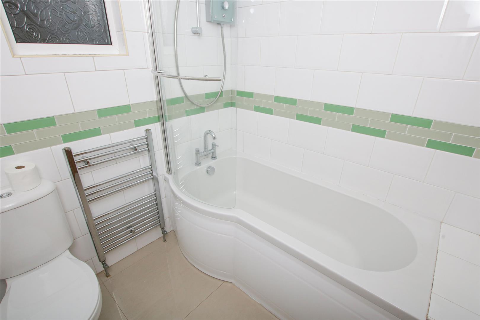 This is all smartly finished with a modern white suite that comprises of a shower style bath with independent electric shower over, a pedestal wash hand basin and low flush wc. There's modern tiling to the walls, coordinating floor tile,