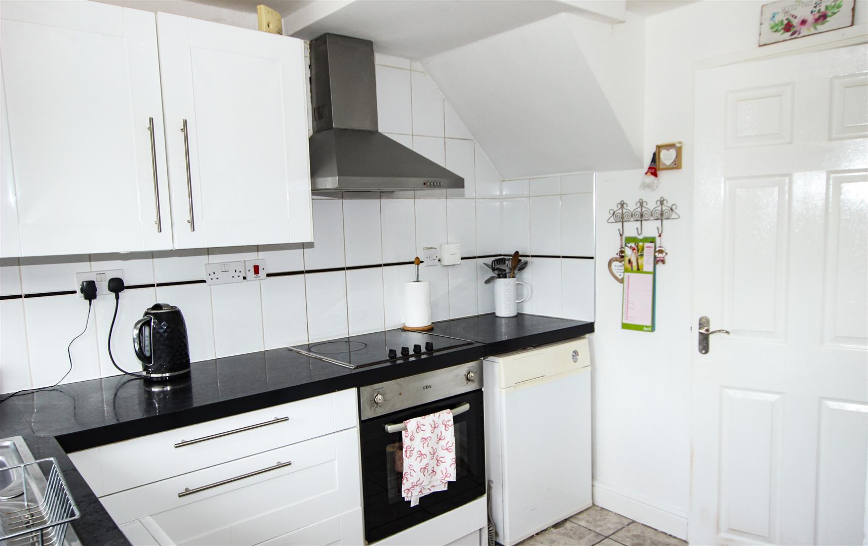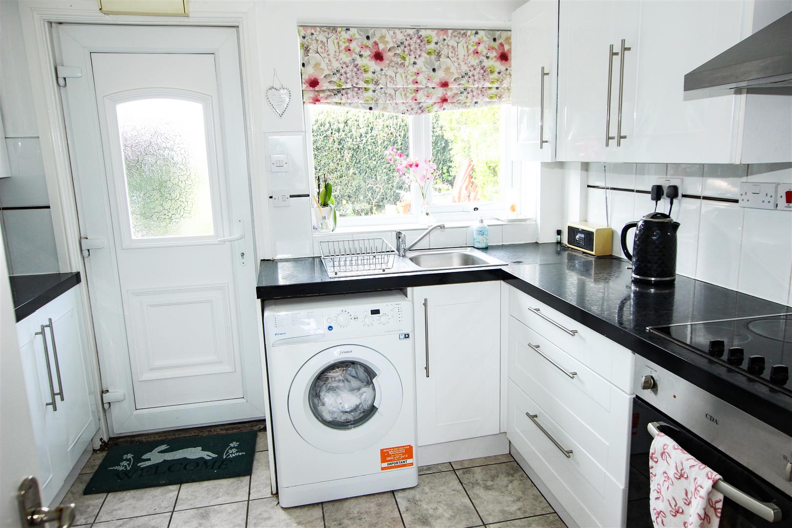 The kitchen is fitted with a range of modern high and low level units finished with a white high gloss cabinet door along with a contrasting work surface, 4 ring ceramic hob with electric oven, chimney style stainless steel extractor hood. There is a single bowl stainless steel sink with a mixer tap, plumbing for a washing machine, space for a free-standing fridge freezer and an oil fired boiler. There is a continuation the ceramic floor through from the hallway, pvc half glazed double door leading out to the rear garden and a pvc double glazed window to the rear and a central ceiling light.