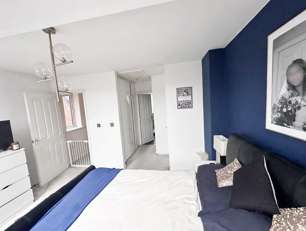 This creates a large principle bedroom suite it has a large double bed area with two double glazed Velux windows which give a pleasant outlook towards open countryside in the distance. There is a central heating radiator, central ceiling light, tall built in storage cupboard and further built in wardrobes to the opposite side. A door continues in to a large en-suite shower room.
