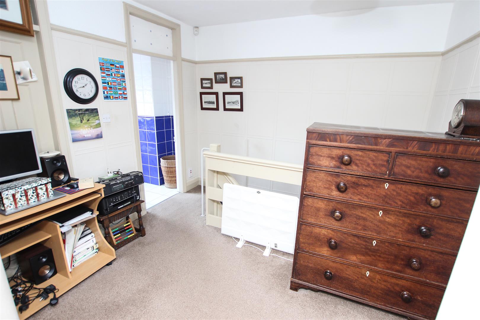 From here there is a continuation of the lincrusta panelling to the walls, picture rail, ceiling light and doors to bedrooms and bathroom.