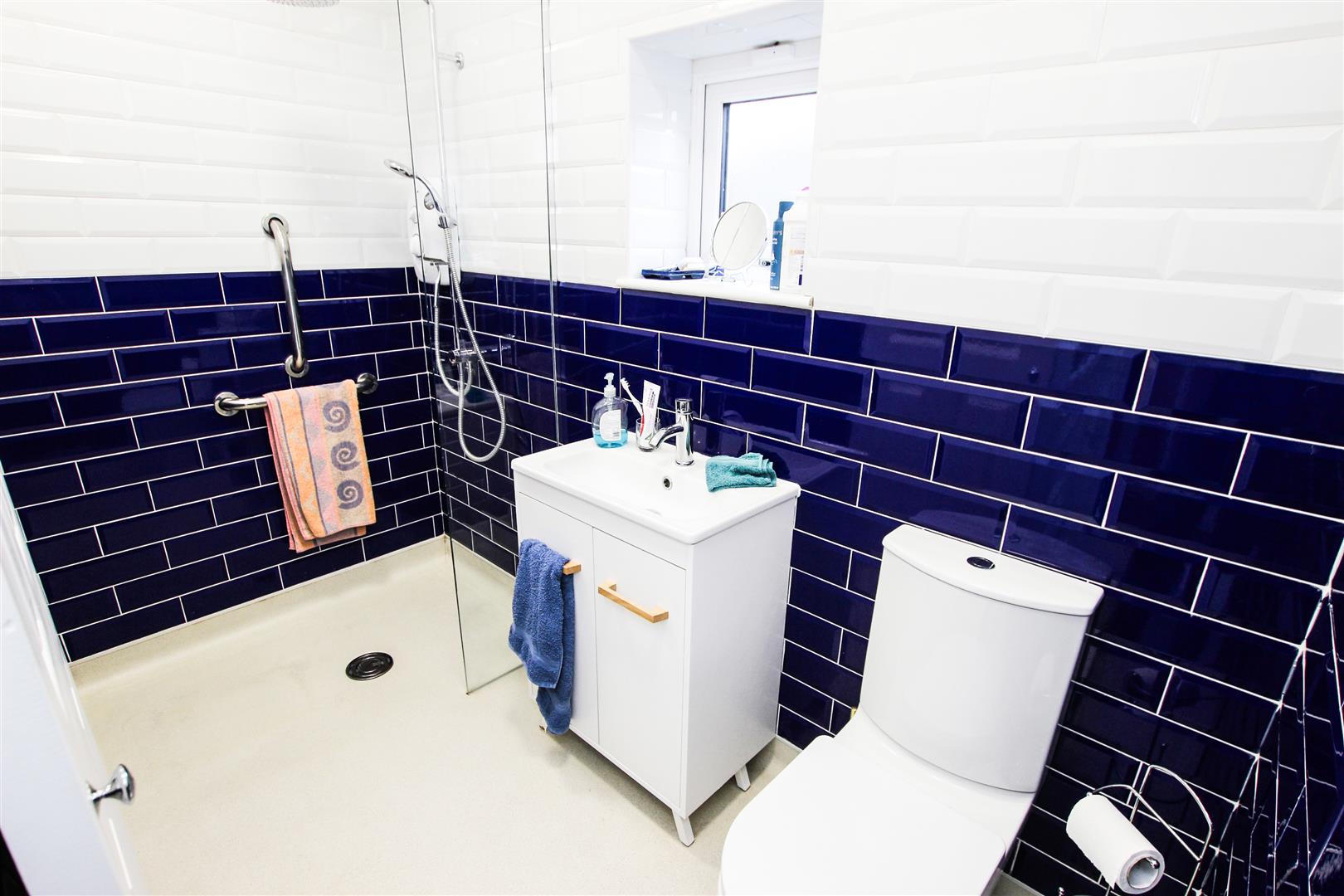 This is all smartly finished with a modern tile along with a glass frameless shower screen with an independent electric shower, pvc double glazed window, wash hand basin inset to vanity unit and a low flush wc. There are two wall lights and an extractor fan and a wall heater.