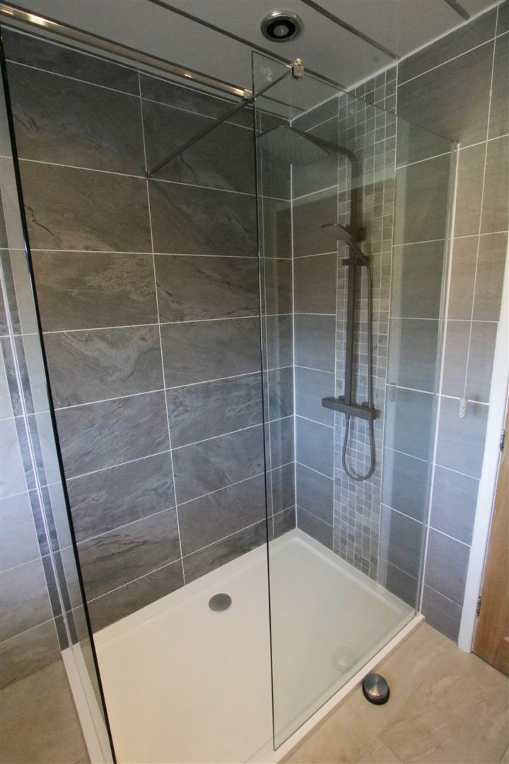This has all been re-modelled and upgraded and creates a contemporary space. It has tiling to the four walls with decorative feature tiling, a mains plumbed thermostatic shower which includes a rainfall shower head, wash hand basin and low flush W/C inset to vanity furniture, coordinating floor tile, contemporary style towel rail/radiator, waterproof ceiling with inset spot lighting and extractor fan. There is also an illuminating wall mirror and a PVC double glazed window.