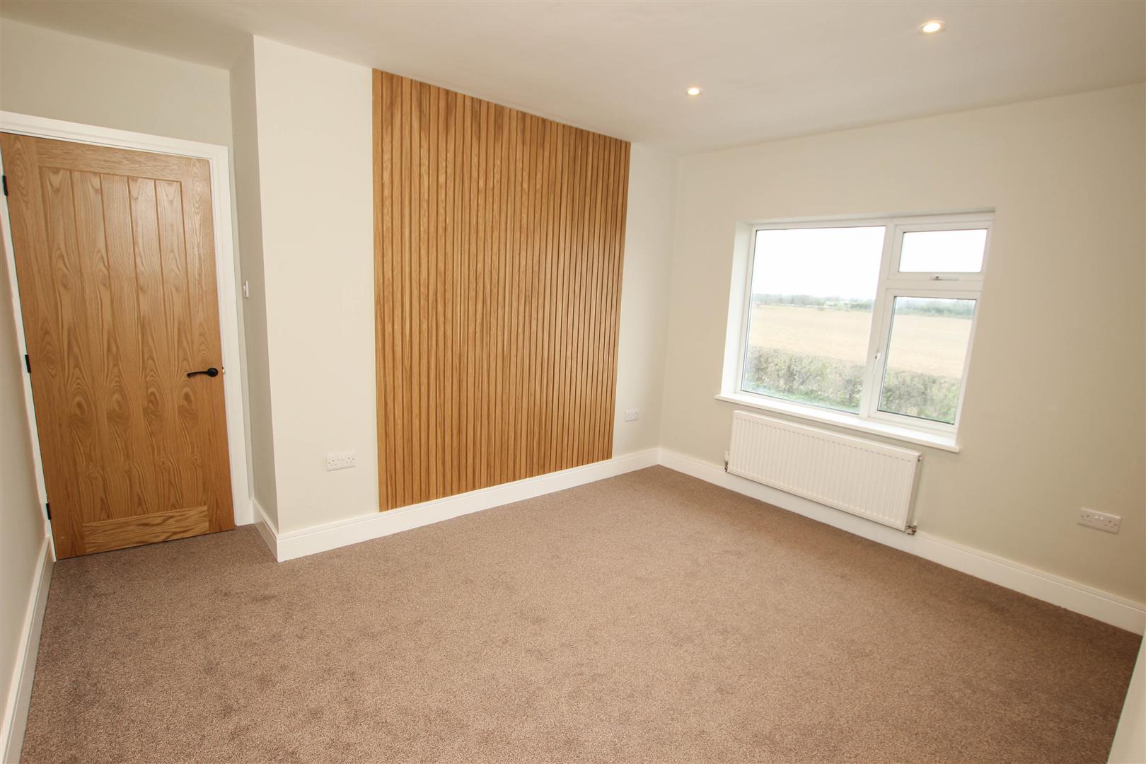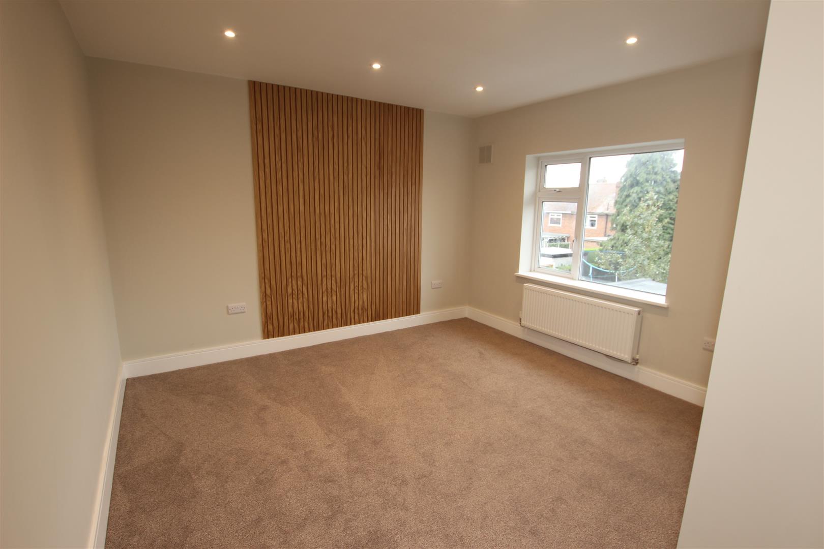 A large double bedroom, it has a pvc double glazed window to the front, central heating radiator, a feature acoustic oak panelled wall and inset spot lighting to the ceiling.