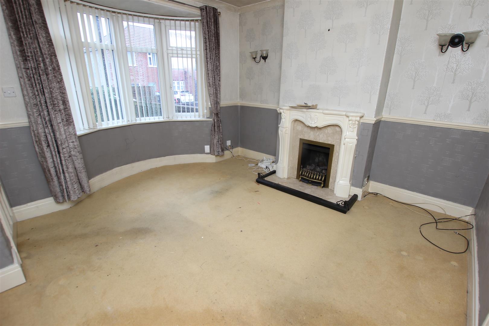 It has a bay window to the front, feature fireplace with living flame gas fire inset (not tested), central ceiling light, wall lights and a matching glazed door that leads through into a separate dining room.