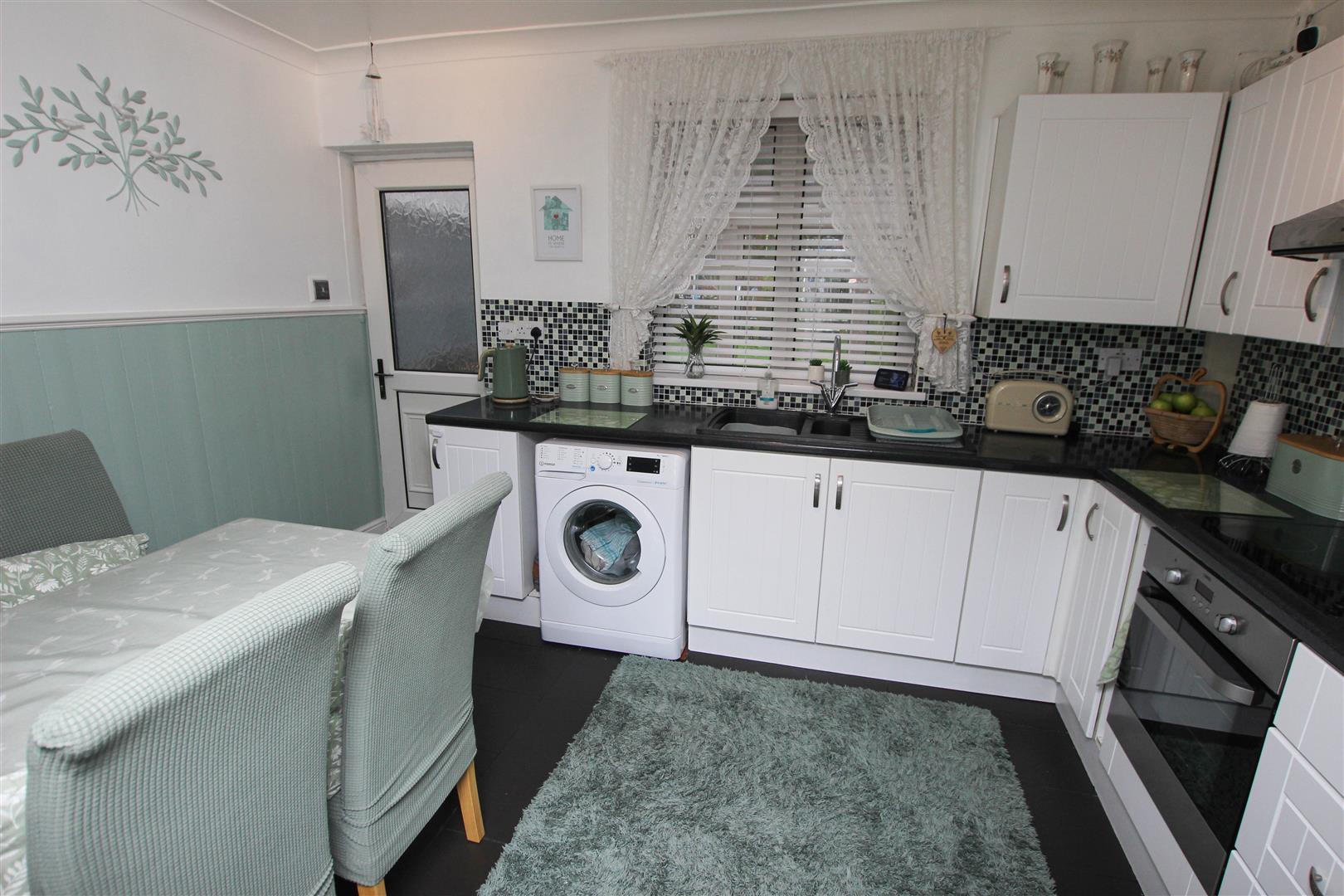All smartly finished with a range of modern high and low level units finished with a white cabinet door, a contrasting rolled edge work surface, a four ring ceramic hob, extractor hood, and an integrated oven. There is plumbing for an automatic washing machine, room for an under counter fridge, a one and half bowl composite style sink with mixer tap, PVC double glazed window, PVC double glazed door, tiled flooring, coving, central ceiling light and a central heating radiator. A door from here leads into the conservatory.