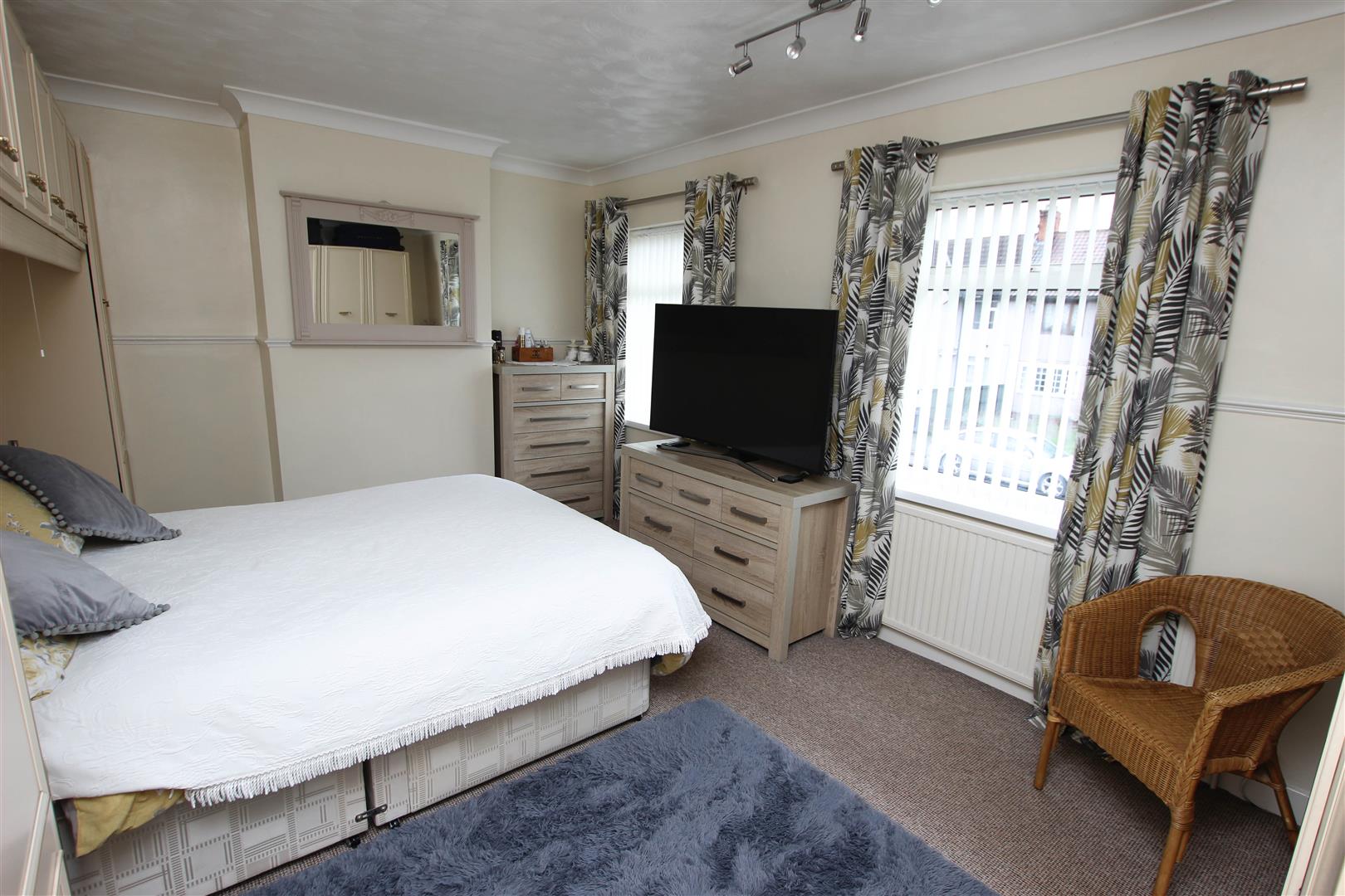 A large double bedroom as evidenced by the room measurements, it has two PVC double glazed windows to the front, central heating radiator, coving and ceiling light.