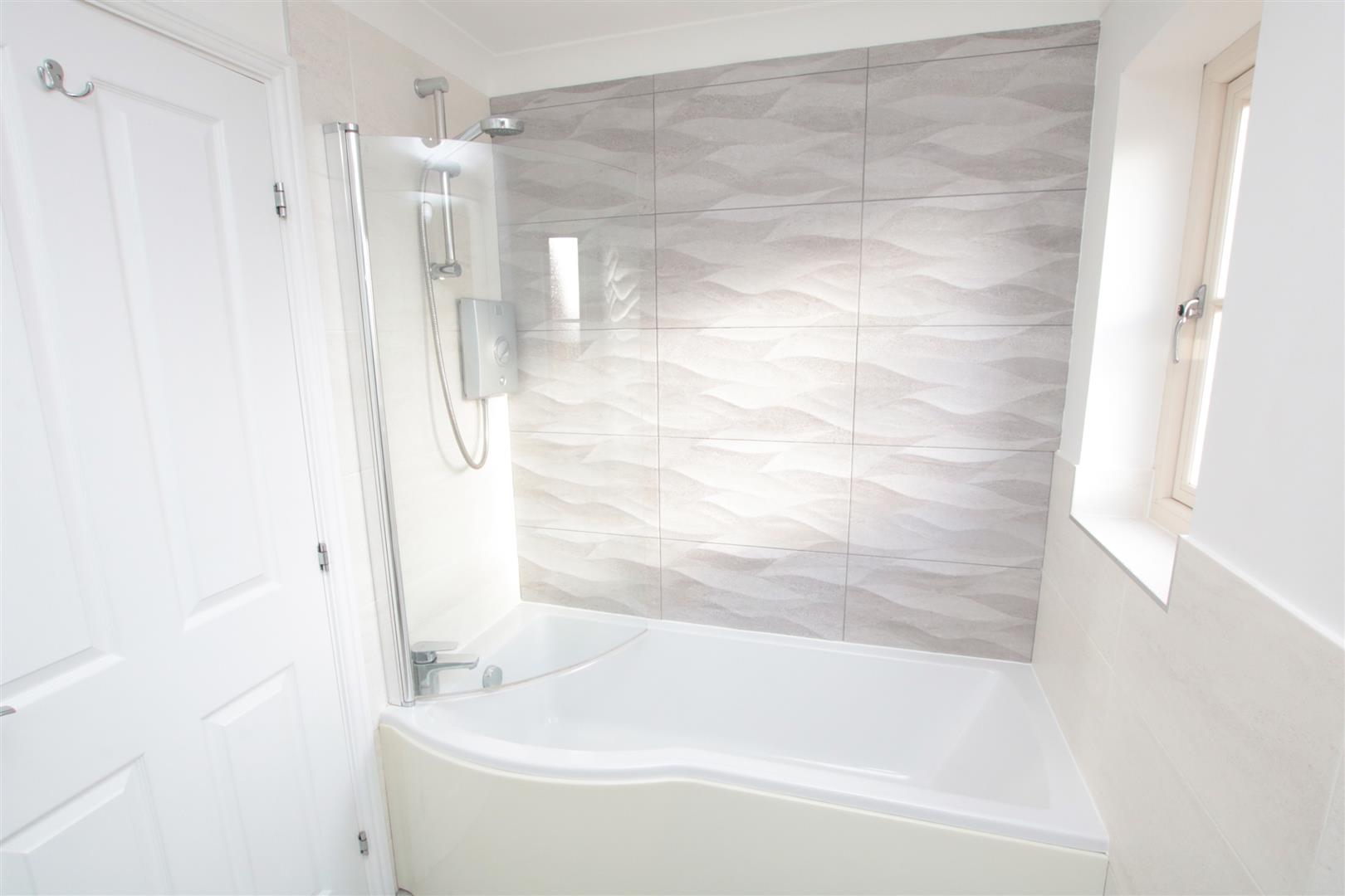 Fitted with a modern white suite that comprises of a shower style bath with offset corner tap, independent electric shower unit, matching wash hand basin and a low flush w/c. There are modern tiles, a pvc double glazed window and a contemporary style towel rail/ radiator.