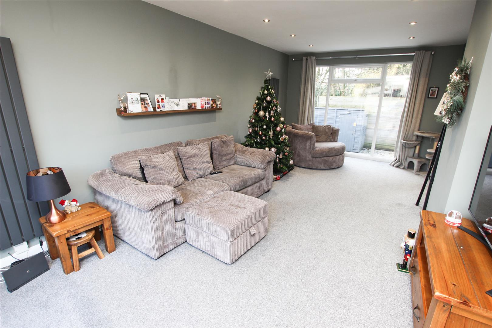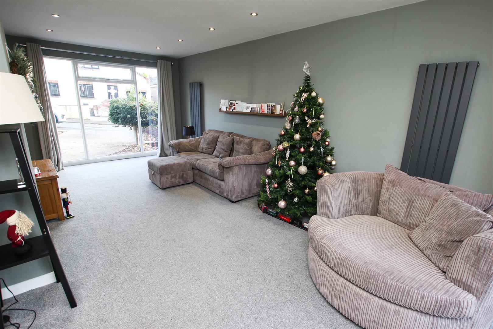 This is a beautiful dual aspect room, it has a broad pvc double glazed window to the front and rear, there is inset spotlighting to the ceiling, two tall contemporary style radiators and double doors which lead into the dining kitchen.