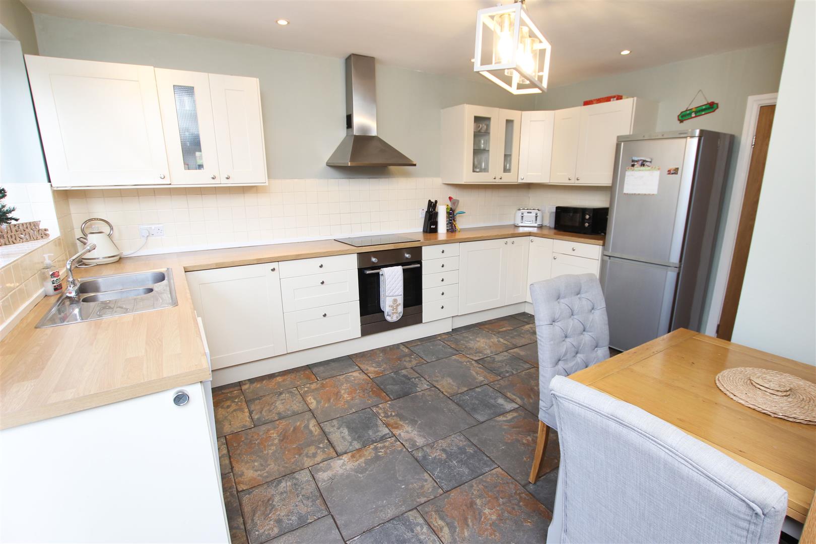 This is all smartly finished with a range of high- and low-level units finished with a roll edged work surface over. There are tile splashbacks, a four-ring induction hob with an extractor hood above and integrated oven beneath. There is a single drainer 1½ bowl stainless steel sink unit with mixer tap, plumbing and recess for dishwasher, room for a tall fridge freezer, tiled flooring, central heating radiator, two built-in storage cupboards plus room for a dining table.