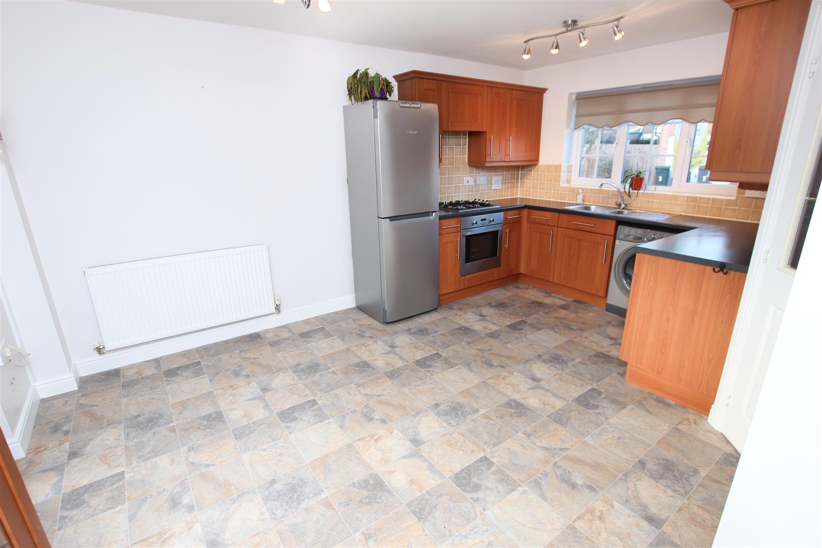Double doors from the entrance hall lead into a beautiful open plan dining kitchen, this is all smartly fitted with a range of modern high and low level units finished with a rolled edge work surface. There is a four ring gas hob with an extractor hood above and integrated oven beneath. There is a single drainer stainless steel sink unit with a mixer tap, plumbing and washing machine included, concealed behind one of the corner cabinets is a wall mounted gas fired boiler which supplies the domestic hot water and central heating systems. There is a deep built-in storage cupboard and pvc double glazed double opening doors which lead out on to the rear garden. There is a large central heating radiator and two ceiling lights.