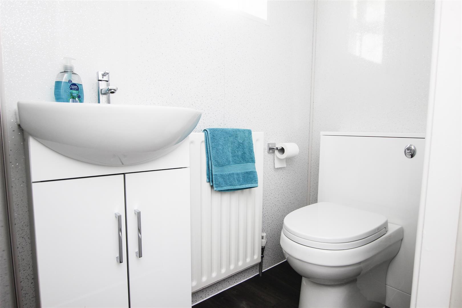 This is fitted with a modern 2 piece white suite comprising of a low flush wc, wash basin inset to vanity unit, central heating radiator, modern diamante style waterproof walling, vinyl flooring and a pvc double glazed window.