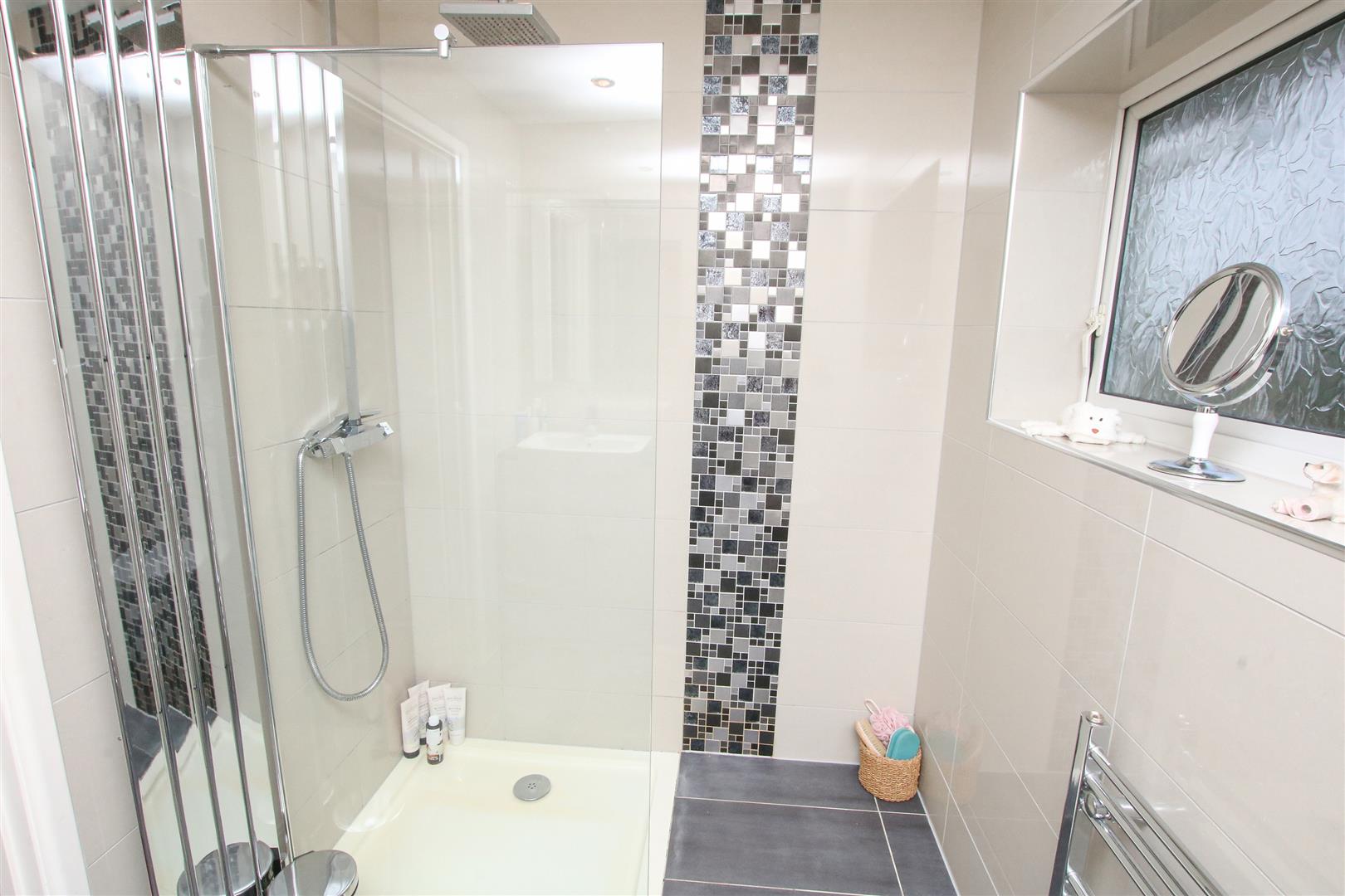 The bathroom has been beautifully upgraded and reconfigured to create a modern shower room. Fitted with a white suite that comprises of a walk in shower, with a mains plumbed thermostatic shower including rainfall shower head and a frameless glass shower screen. A matching wash basin and WC inset to vanity cabinet, modern tiling to the four walls, coordinating floor tile, PVC double glazed window, chrome towel rail, inset spot lighting to the ceiling, contemporary style radiator and an extractor fan.