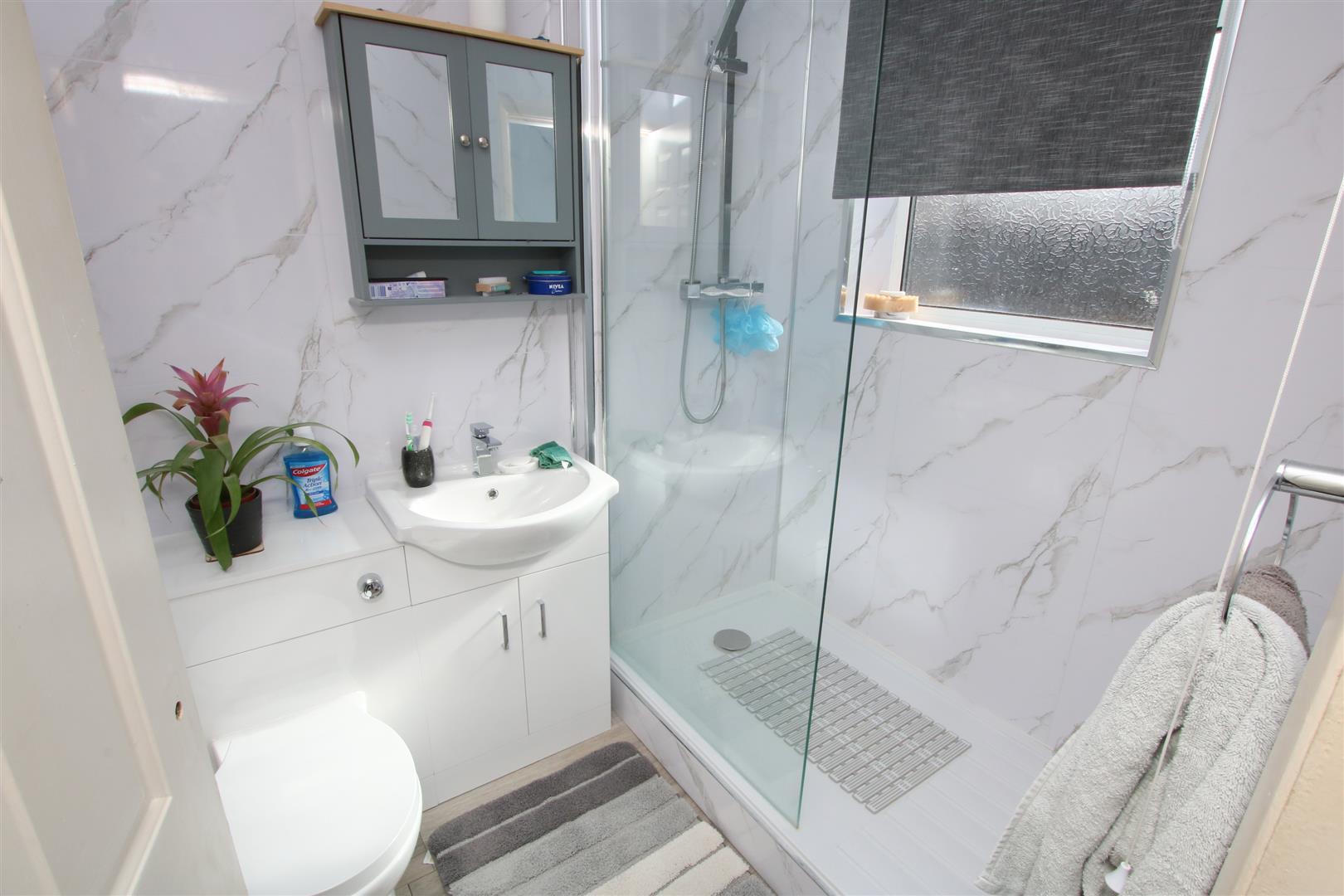 Again, this is all smartly finished with a modern white suite that comprises of a walk-in shower with modern tile marble tile effect walling.  There is a coordinating wash hand basin and a low flush wc inset to fitted bathroom furniture, a contemporary style towel rail/radiator, ceiling light with matching waterproof ceiling.